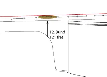 The measurement is done by comparison of the harmonic and the fretted note at the 12th fret. A harmonic arises by placing the fingertip on a string and then plucking the string while simultaneously lifting the fingertip. The overtones created by this technique arise only at certain points on the string, such as in this case, the exact midpoint being at 12th fret.